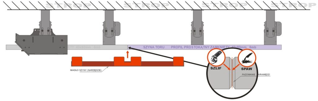 jak za pierwszym razem szynę z przyspawanymi uchwytami i wyposażonymi w wieszak górny łączymy z poprzednim fragmentem szyny za