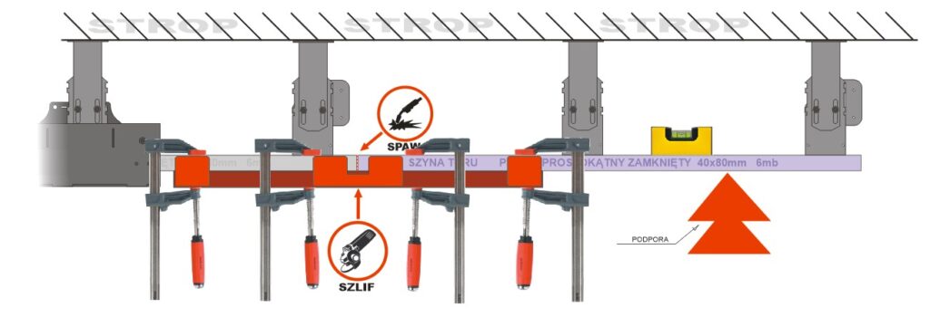 Profil szyny podeprzeć należy w połowie odległości między przyspawanymi uchwytami dociskając uchwyty do stropu.