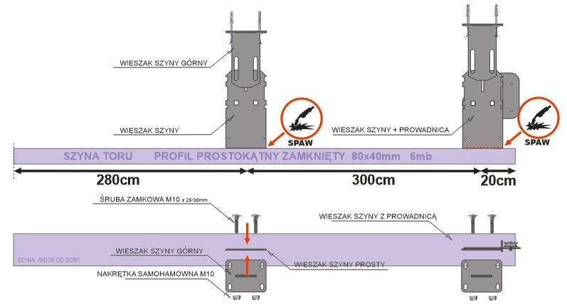 Jeśli ostatni profil toru ma długość mniejszą niż 3m nie spawamy do niego uchwytów wieszaka. Ostatnim wieszakiem stropowym będzie w