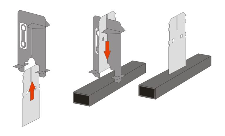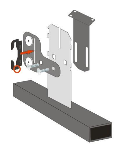 a kwadratowy otwór wieszaka zapewni prawidłowe trzymanie śruby. Następnie od prawej strony szyny nakładamy górny wieszak szyny i