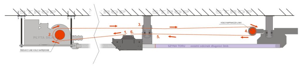wszystkie mijane przez wózek połączenia toru i prowadnice rolkowe na wieszakach. Oczywiście wózek z zainstalowaną linką będzie wykazywał