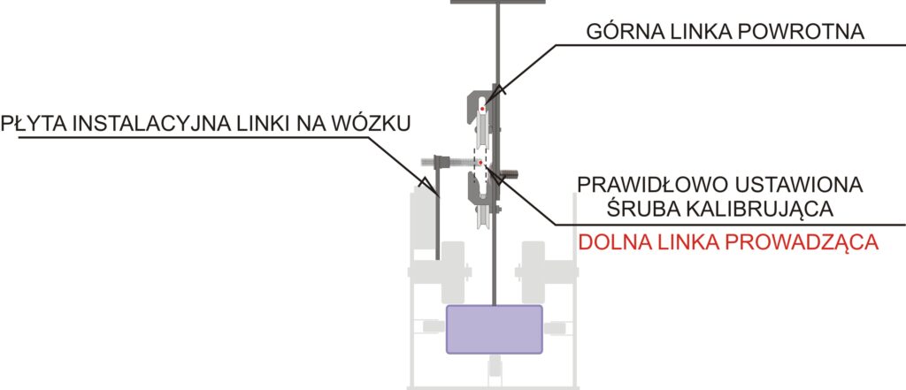 na rolkach podporowych oraz aby śruby nie uderzały w mocowania szyny podczas przejazdu wózka (zbyt mocno wykręcone). Następnie przy