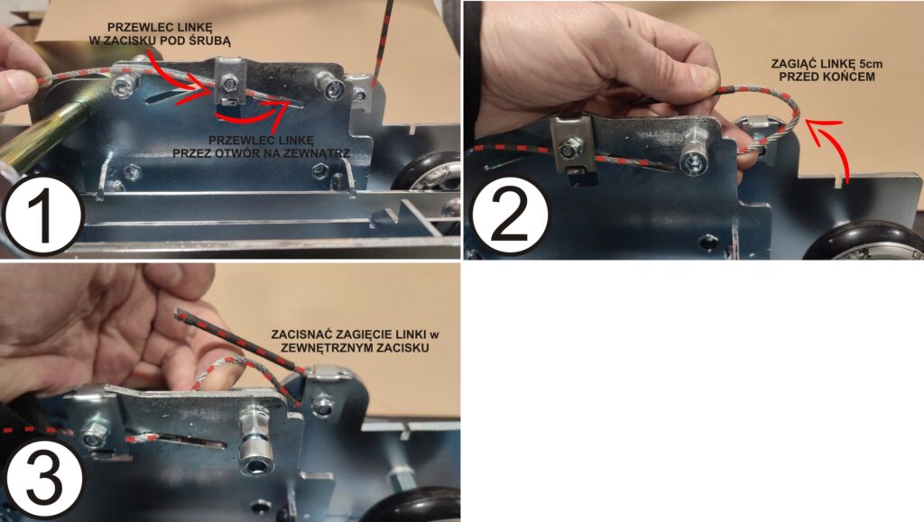 Montaż linki zaczynamy od wózka tarczy gdzie przymocowany będzie jeden z jej końców (1.) Końcówkę liny przewlekamy od spodu dookoła